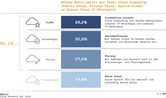 Ein Viertel der Unternehmen hat demnach sogar schon Cloud-Anwendungen im Einsatz, ein weiteres Drittel führt gerade ein erstes Cloud-Projekt ein. Und 27 Prozent befinden sich in der Planungsphase. Nur noch 15 Prozent beteuern dagegen, die Cloud spiele weder heute noch in Zukunft eine Rolle für sie.