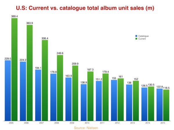 Damit nicht genug: Die Digitalisierung hat, wenn auch vermutlich nicht als alleinige Ursache, ein weiteres Paradoxon erzeugt: Bei den Albumverkäufen lag in den Vereinigten Staaten – als Musikmarkt immer der Vorreiter für alle anderen Märkte – im vergangenen Jahr erstmals der Altkatalog von etablierten Musikern vor den Verkäufen von Neuerscheinungen: