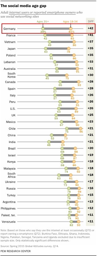 Damit nicht genug: Bei der sogenannten Social-Media-Alterskluft rangiert Deutschland umgekehrt auf Rang eins – das bedeutet: Nur 39 Prozent der über 35-Jährigen, aber 81 Prozent der 18- bis 34-Jährigen nutzen soziale Netzwerte. Das ergibt eine Differenz von 42 Prozent – mehr als bei allen anderen Ländern: