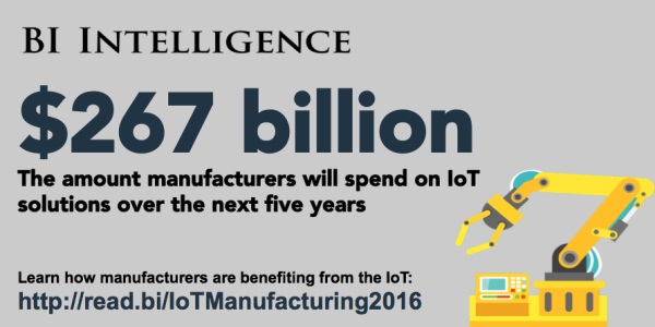Insgesamt sollen die Fertigungsunternehmen rund um den Globus in den kommenden fünf Jahren die stattliche Summe von 267 Milliarden Dollar ins Internet der Dinge investieren, prophezeiht BI Intelligence. Der Markt bleibt damit einer der spannendsten in der näheren Zukunft.