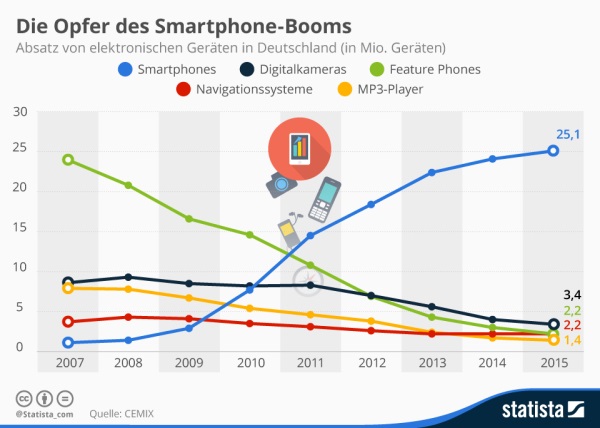 Nicht viel anders sieht es mit Digitalkameras und Navigationssystemen aus. Umgekehrt stieg der Absatz der Smartphones als digitale Alleskönner auf zuletzt 25,1 Millionen Geräte – Smartphones killed the Camera-Star, sozusagen: Erst Ende November 2015 gab etwa Samsung sein Kamerageschäft in Deutschland auf.