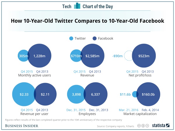 Zum Beispiel bei den monatlich aktiven Nutzern weltweit: Während Facebook nach einer Dekade – also zum Stichtag viertes Quartal 2013 – fast 1,23 Milliarden Nutzer aufwies, kommt Twitter nach 10 Jahren auf gerade mal 305 Millionen, also ziemlich genau ein Viertel. Ähnlich sieht es bei Umsatz, Mitarbeitern oder der Marktkapitalisierung aus.