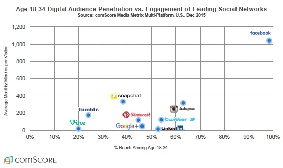 Demnach nutzen fast 100 Prozent der Amerikaner zwischen 18 und 34 Jahren Facebook – und das mehr als 1000 Minuten im Monat. Das ist gut zweieinhalb mal so viel wie die am zweitstärksten genutzte – und jüngst stark gehypte – Messaging-App Snapchat (350 Minuten im Monat). Mit unter 40 Prozent liegt dessen Verbreitung jedoch deutlich hinter Instagram (rund 63 Prozent), das aber zu Facebook gehört.