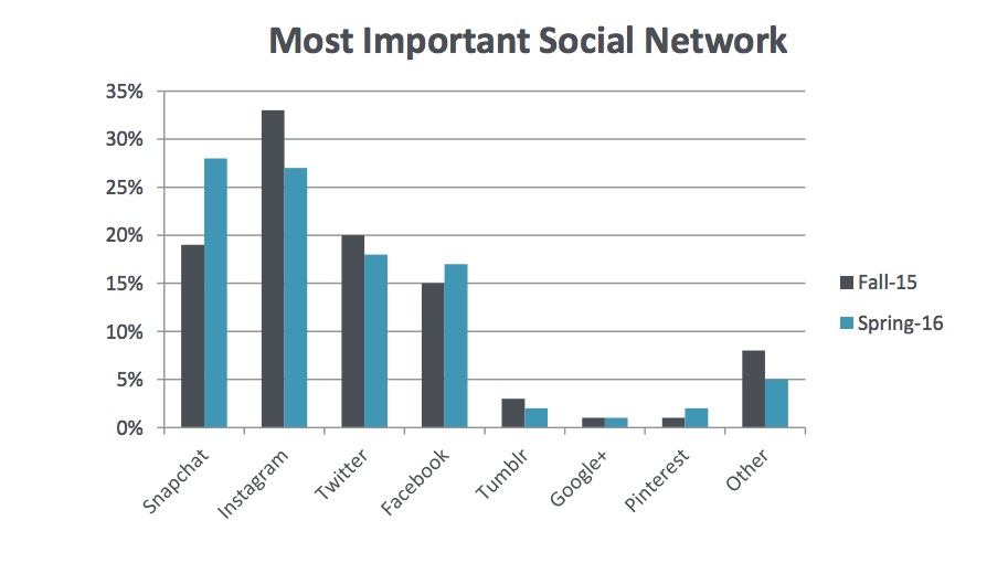 Demnach bezeichnen mittlerweile 28 Prozent der 13- bis 19-jährigen Amerikaner die Messaging-App Snapchat als wichtigstes soziales Netzwerk – vor einem halben Jahr waren es erst 19 Prozent.