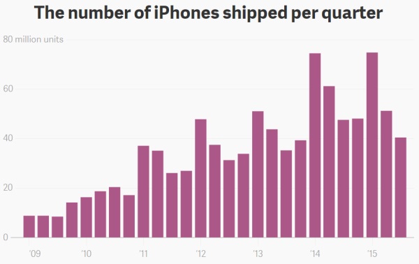 So schrumpften die Verkäufe des Megasellers iPhone in den drei Monaten zwischen April und Juni im Jahresvergleich um satte 21 Prozent auf nunmehr 40,4 Millionen Smartphones. Zum Vergleich: Auf dem Höhepunkt im Weihnachtsquartal 2015 waren es noch fast 75 Millionen iPhones.