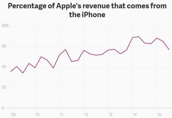 Mehr noch: Durch den Einbruch ist auch die Bedeutung des Smartphone-Geschäfts für den Gesamtkonzern geschrumpft: Während das iPhone in der Spitze für fast 70 Prozent des Apple-Umsatzes sorgte, liegt jene Rate inzwischen bei nur noch bei gut 57 Prozent: