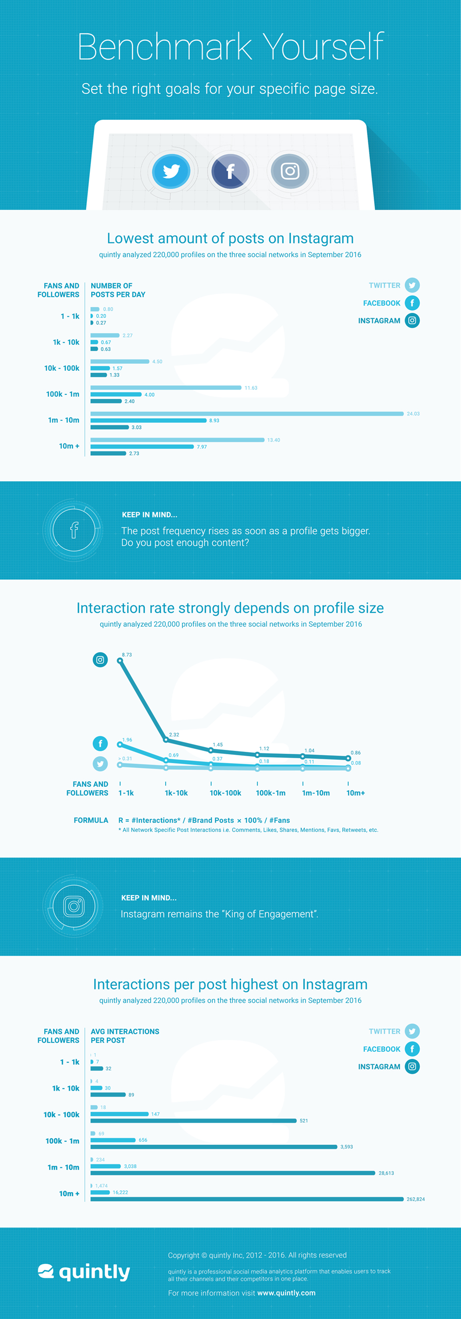 So jedenfalls lautet das Ergebnis einer Mitte Dezember veröffentlichten Benchmark-Studie des auf soziale Analysetools spezialisierten Anbieters Quintly aus Köln. Dafür haben die Social-Media-Experten 220,000 Profile in den drei großen Netzwerken Facebook, Twitter und Instagram zwischen Juli to September 2016 untersucht.