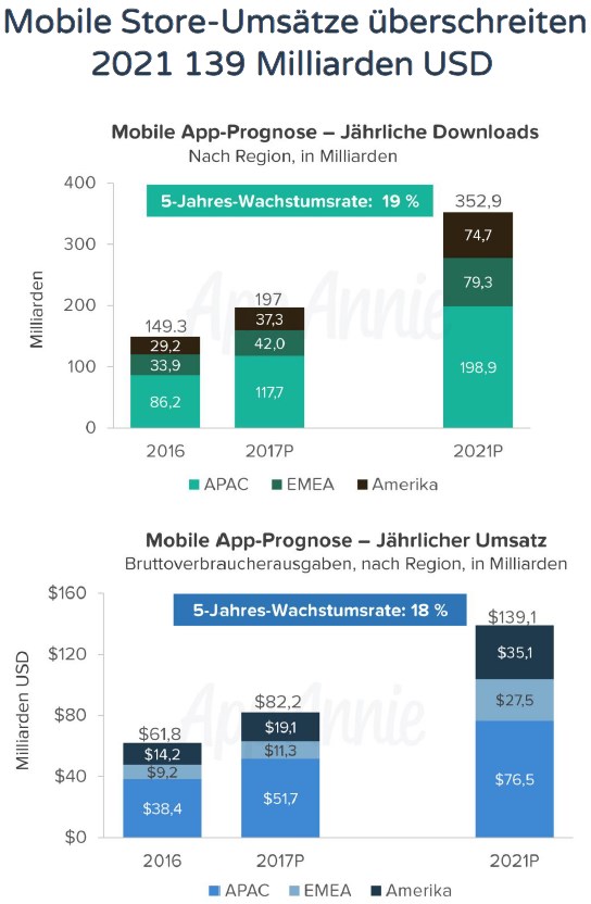 Bei den Umsätzen bleibt die Wachstumsrate mit 18 Prozent ähnlich hoch: So geben die Smartphone-Nutzer im Jahr 2021 weltweit fast 140 Milliarden Dollar für App-Downloads aus – auch dies ist mehr als doppelt so viel als die gut 62 Milliarden Dollar im vergangenen Jahr.