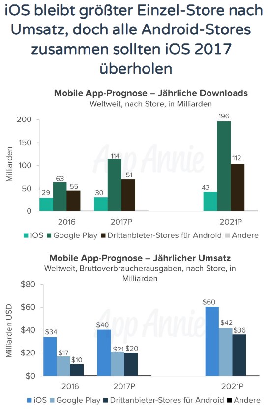 Bei den Umsätzen erfolgt hingegen bereits in diesem Jahr eine Wachablösung: Zwar bleibt der App Store von Apple bis 2021 der umsatzstärkste Einzel-Store. Alle Android-Marktplätze gemeinsam kommen schon in diesem Jahr auf 41 Milliarden Dollar – knapp über Apple mit seinen 40 Milliarden Dollar.