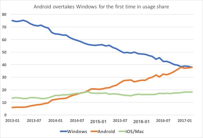 Auch wenn die Daten anderer Marktforscher wegen unterschiedlicher Messmethoden absolut gesehen anders aussehen mögen, ist der Trend der Plattformen relativ zueinander klar: Die Nutzung von Windows, das noch Anfang 2013, also vor gerade mal vier Jahren, bei 75 Prozent lag, hat kontinuierlich abgenommen – im gleichen Maße hat Android zugelegt.