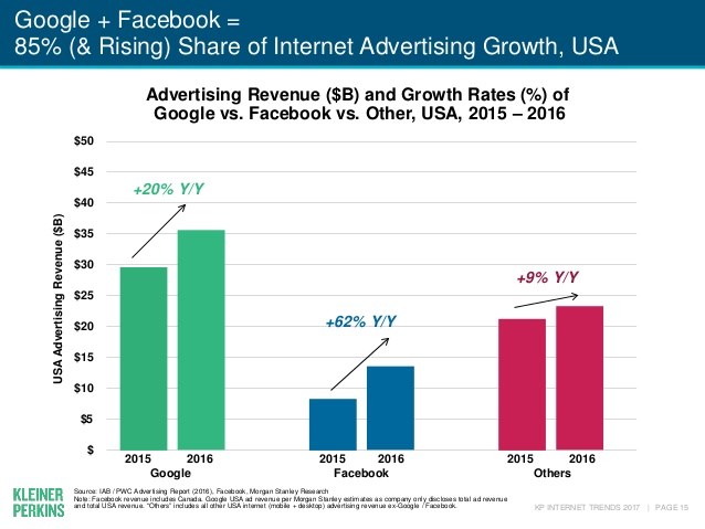 Zwar sind diese Daten nur US-Zahlen, doch das globale Bild dürfte nicht nennenswert anders aussehen: So haben Google und Facebook in ihrem Heimatmarkt beim Wachstum des Internet-Werbegeschäfts von 2015 auf 2016 gut 85 Prozent Prozent für sich abgeschöpft.