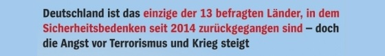 Trotz großer Cyberattacken und Terrorangriffe gingen die Bedenken der Menschen in Deutschland seit 2014 demnach um sieben Prozent zurück; weltweit stieg der Index um 20 Prozent. Die größten Sorgen machen sie sich der Studie zufolge um Terrorismus und Krieg – 55 Prozent der Befragten äußerten sich als sehr bis extrem besorgt.