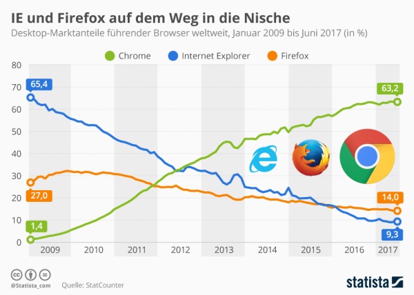Aber auch am Desktop-Rechnern ist Chrome längst mehr oder weniger auf dem Weg zum Monopol, wie jüngst veröffentlichte Zahlen des US-Marktforschers StatCounter belegen: Stand Juni 2017 nutzten bereits knapp zwei von drei Internet-Usern Chrome zum Surfen (63,2 Prozent) .