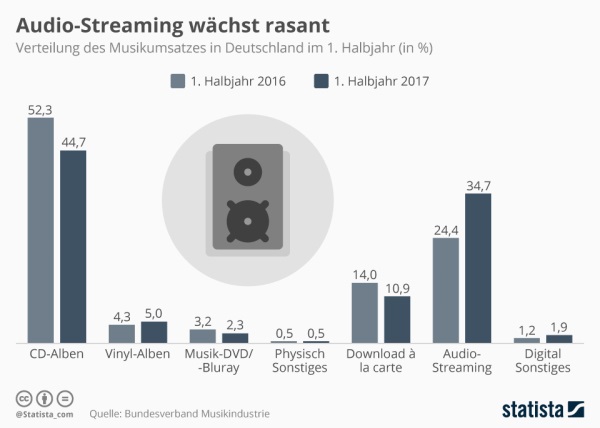 Damit folgt die hiesige Entwicklung dem Vorbild des weltgrößten Musikmarktes USA: Dort kommen digitalen Abos und Streaming allein bereits auf mehr als die Hälfte des Branchenumsatzes (52 Prozent).
