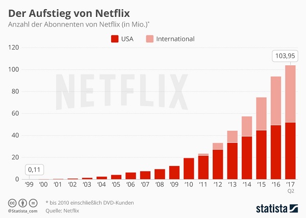Die Erfolgsgeschichte von Netflix hat übrigens erst Ende August sein zwanzigjähriges Jubiläum begangen: Im August 1997 hat CEO Reed Hastings das Unternehmen gegründet – seinerzeit noch als Internet-Verleiher von DVDs. Im Jahr 2007 startete Hastings parallel zum DVD-Verleih das Streaming-Angebot – und mauserte sich damit zum TV-Revolutionär: