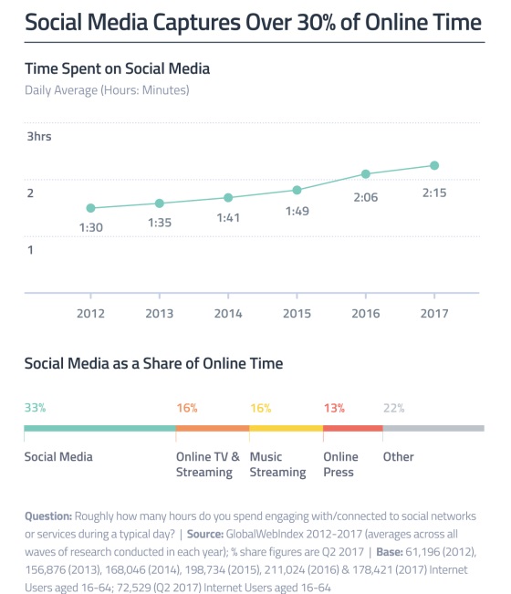 Und sie wächst und wächst und wächst – die Rede ist von der durchschnittlichen Zeit, welche die Internet-Nutzer mit Social Media verbringen: Laut kürzlich veröffentlichten Zahlen des britischen Marktforschers GlobalWebIndex tummeln sich die Nutzer inzwischen zweieinviertel Stunden täglich in Facebook, Twitter & Co.