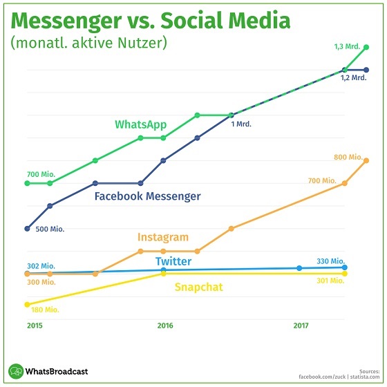 Der Trend in Deutschland deckt sich mit den weltweiten Zahlen – zumindest bei den Messaging-Diensten: Erst im September 2017 überquerte etwa der Facebook Messenger die Marke von 1,3 Milliarden monatlich aktiven Nutzern: