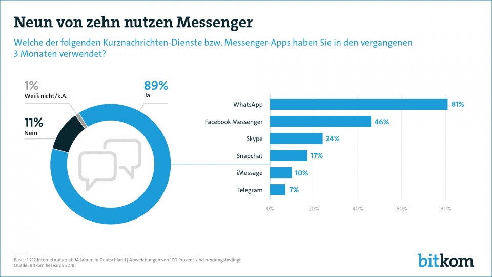 Das deckt sich mit einer Anfang Mai veröffentlichten Studie des ITK-Verbandes Bitkom: Demnach verwenden neun von zehn Internet-Nutzern in Deutschland Messenger-Dienste wie WhatsApp, Facebook Messenger oder Skype (89 Prozent):