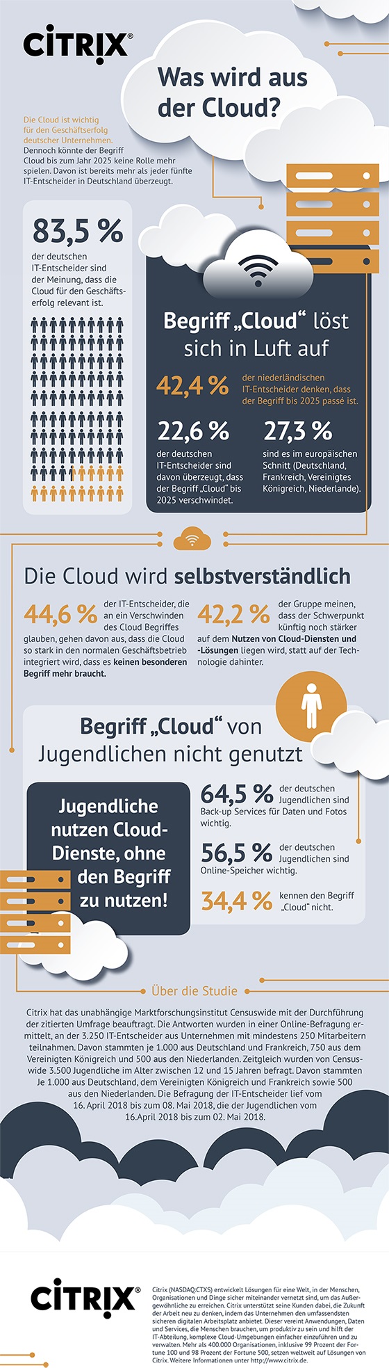 Davon ist jedenfalls eine deutliche Mehrheit der hiesigen IT-Entscheider – nämlich vier von fünf CIOs (83,5 Prozent) – überzeugt. Dennoch könnte der Begriff Cloud bis zum Jahr 2025 keine Rolle mehr spielen. Davon ist bereits mehr als jeder fünfte IT-Entscheider (22,6 Prozent) in Deutschland überzeugt. Das sind Ergebnisse eine aktuelle Studie des amerikanischen Softwareanbieter Citrix.