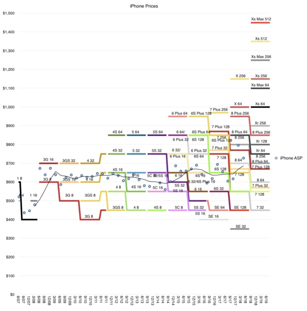 Dennoch schafft Apple es, seinen Umsatz weiter zu steigern – und zwar auf zwei Wegen: Ein Blick auf die Preispunkte der unterschiedlichen iPhone-Modelle der vergangenen Jahre beweist, wie sehr Apple an der Preisschraube gedreht hat. Oder, wie es der finnische Mobile-Analyst Horace Dediu so treffend ausdrückt: Stairway to Heaven: