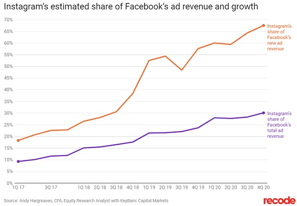 Dieser Anteil soll sich laut Prognose von Hargreaves bis zum Jahr 2020 auf 30 Prozent der gesamten Facebook-Werbeerlöse verdoppeln. So würden bis dahin fast 70 Prozent der neuen Umsätze des Gesamtkonzerns auf Instagram entfallen: