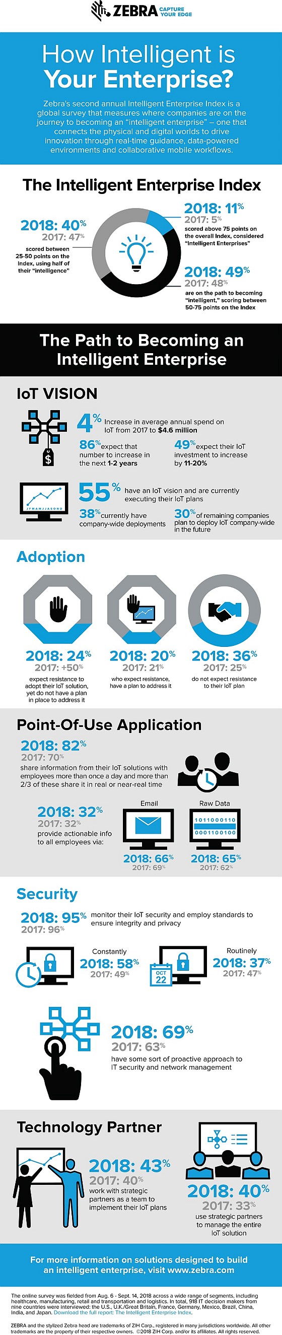 Laut einer aktuellen Studie des amerikanischen Tech-Anbieters Zebra Technologies ist der Fortschritt beim Einsatz von IoT-Lösungen durchaus beachtlich: So hat sich die Zahl der vollständig vernetzten Unternehmen 2018 im Vergleich zum Vorjahr auf 11 Prozent verdoppelt.