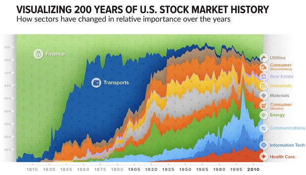 Diese und andere Erkenntnisse hat kürzlich die amerikanische Finanzwebsite Visual Capitalist, die auf tolle Visualisierung rund um Finanzmarktthemen spezialisiert ist, mit einer sehenswerten Infografik herausgearbeitet: Nämlich 200 Jahre amerikanische Börse abhängig von der Marktkapitalisierung der unterschiedlichen Industrien.