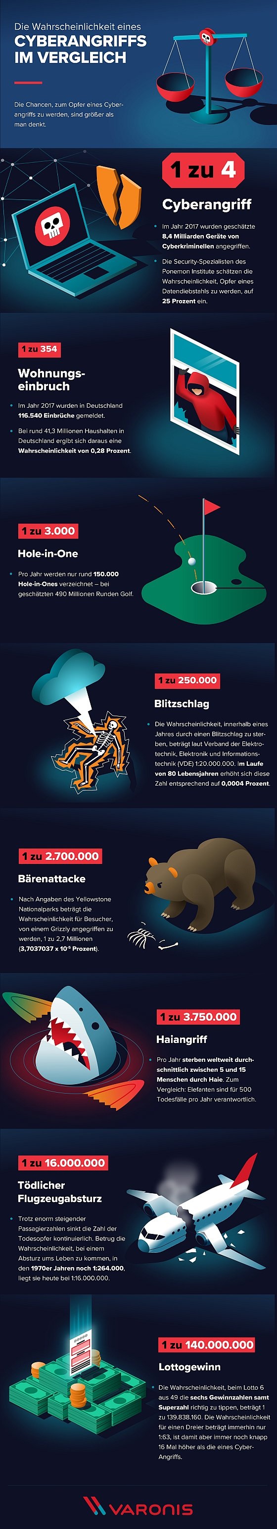 Vor diesem Hintergrund liegt es nach, sich die Wahrscheinlichkeit eines Hacker-Angriffs mit anderen dieser „das passiert eh nicht“-Ereignissen vor Augen zu führen. Wenn die Wahrscheinlichkeit eines Cyberangriffs von 1:4 noch nicht überzeugend genug ist, sind es vielleicht diese Zahlen: