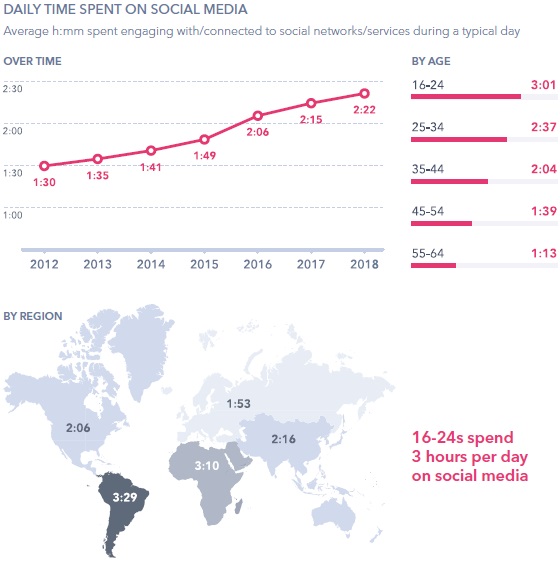 So stieg die Zeit, welche die User rund um den Erdball in Social Media verbringen, nach kürzlich veröffentlichten Zahlen des britischen Marktforschers GlobalWebIndex auf nunmehr 2 Stunden und 22 Minuten am Tag. Im Jahr davor waren es noch sieben Minuten weniger.