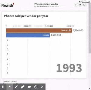Eine Animation zeigt Aufstieg und Fall der verschiedenen Weltmarktführer im Handy-Geschäft wie Motorola oder Nokia seit dem Jahr 1994.