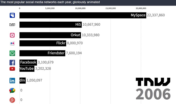Eine Animation zeigt Aufstieg und Fall der verschiedenen Weltmarktführer im Social-Media-Segment seit dem Urahn Friendster im Jahr 2002.