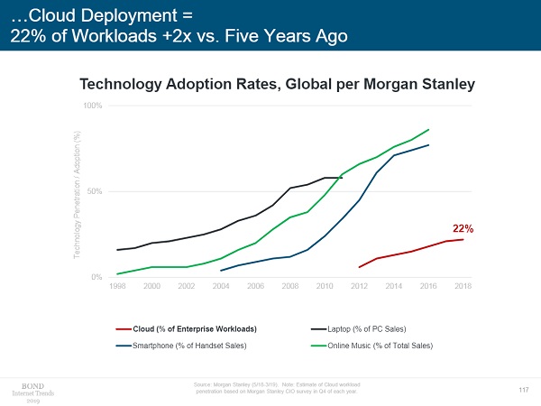 Laut des Meeker-Reports wickelt Cloud Computing, zumindest in den USA, inzwischen 22 Prozent aller sogenannter „Enterprise Workloads“ ab. Das ist eine Verdopplung gegenüber dem Wert von vor fünf Jahren, also im Jahr 2013.