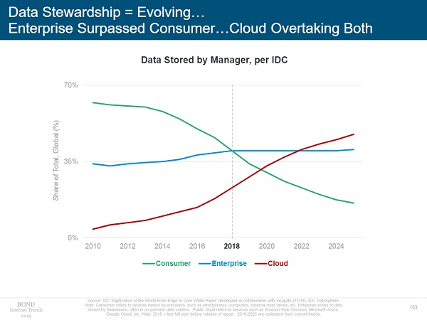 Wie sehr die Cloud weiterhin im Kommen ist, zeigt ein Blick auf eine andere Metrik, nämlich Daten: Gemessen am gesamten Datenaufkommen, werden bald schon die von Unternehmen erzeugten Volumina, Stichwort Internet of Things und Vernetzung, die Daten der Endnutzer überflügeln – bis in nicht allzuferner Zukunft ungefähr im Jahr 2022 die Cloud alle beide abhängt.