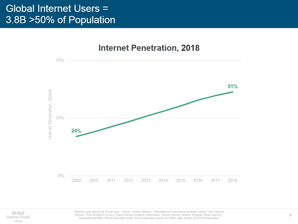 Denn laut Meeker surfen aktuell rund 3,8 Milliarden Menschen rund um den Globus im Internet. Damit lag die Penetrationsrate im vergangenen Jahr erstmals bei über 50 Prozent, das heißt: Mehr als die Hälfte der Weltbevölkerung ist inzwischen online.