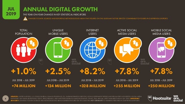 Seit Juli 2018 hat die Zahl der Nutzer von sozialen Netzwerken damit um 255 Millionen Nutzern zugelegt, ein Plus um acht Prozent binnen eines Jahres. Damit ist das Wachstum zwar gegenüber dem Jahr davor deutlich gefallen, als die Zahl der Social-Media-Jünger noch um 390 Millionen Menschen oder plus 13 Prozent zugelegt hatte.