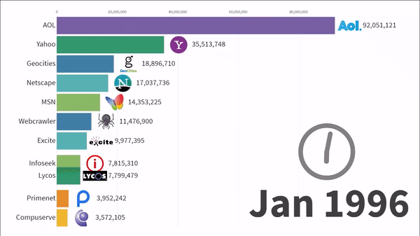 Eine Animation zeigt die – gemessen an den Aufrufen im Monat – populärsten Internet-Seiten in den vergangenen 23 Jahren, mit manchen Überraschungen.