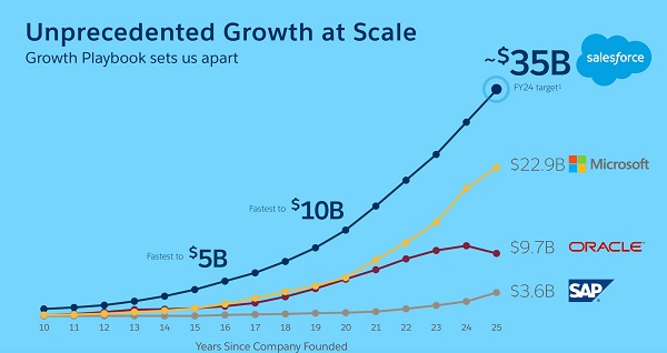 Das Ergebnis: Die Schwelle von zehn Millarden Dollar – die Salesforce im Geschäftsjahr 2018, also dem 20. Jahr seit der Gründung im Jahr 1999 erreicht hat – hat der Cloud-Spezialist deutlich schneller überquert als seine Rivalen. Und bis zum Geschäftsjahr 2024 peilt die Benioff-Company sogar stolze 35 Milliarden Dollar an: