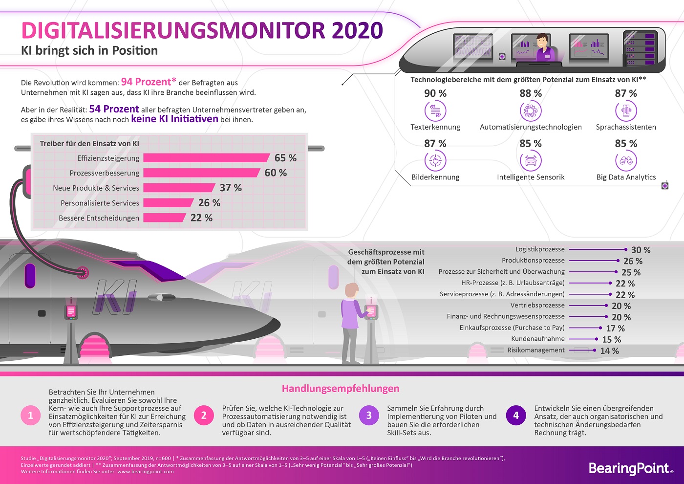 Allgemein können sich die Befragten sehr gut die Technologiebereiche für den Einsatz von KI vorstellen. Dazu gehören Einsatzgebiete wie Texterkennung (90 Prozent), Automatisierungstechnologien (88 Prozent), Sprachassistenten (87 Prozent) und Bilderkennung (87 Prozent).