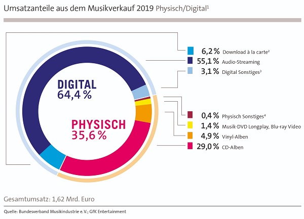 In Deutschland ist jener Swing bisher nicht ganz so dramatisch – vermutlich deshalb, weil der konservativere deutsche Konsument längst nicht so schnell wie sein US-Gegenpart physikalische Tonträger verschmäht hat: CDs kommen hierzulande immer noch auf 29 Prozent am Gesamtumsatz – in den USA lag der Anteil 2019 nur noch bei einem Zehntel des Marktes.