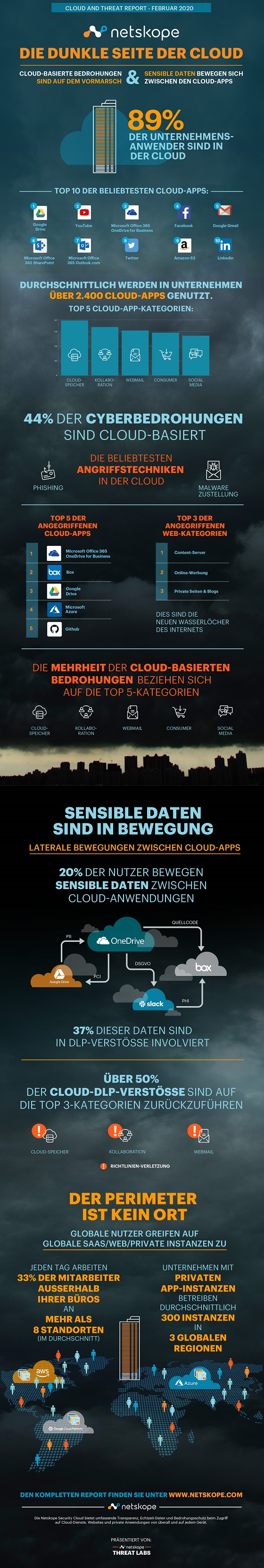 So stammt inzwischen fast die Hälfte aller bösartigen Bedrohungen aus der Cloud (44 Prozent). Offensichtlich nutzen Cyberkriminelle vermehrt die Cloud als eine effektive Methode, um unerkannt zu bleiben. Das ist der zentrale Befund einer Auswertung von Millionen Nutzerdaten weltweit, die der amerikanische Cloud-Security-Spezialist Netskope aus Santa Clara/Kalifornien durchgeführt hat.