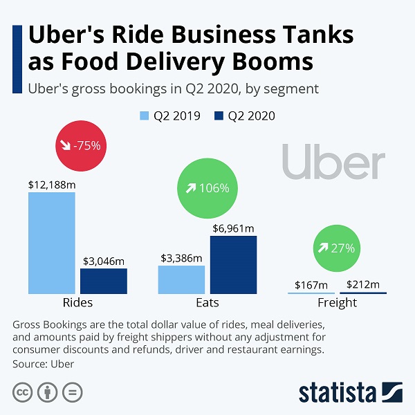 Im jüngsten Quartal sinken die vermittelten Fahrten um drei Viertel, während sich Essenslieferungen verdoppeln – Uber ist heute ein anderes Unternehmen.