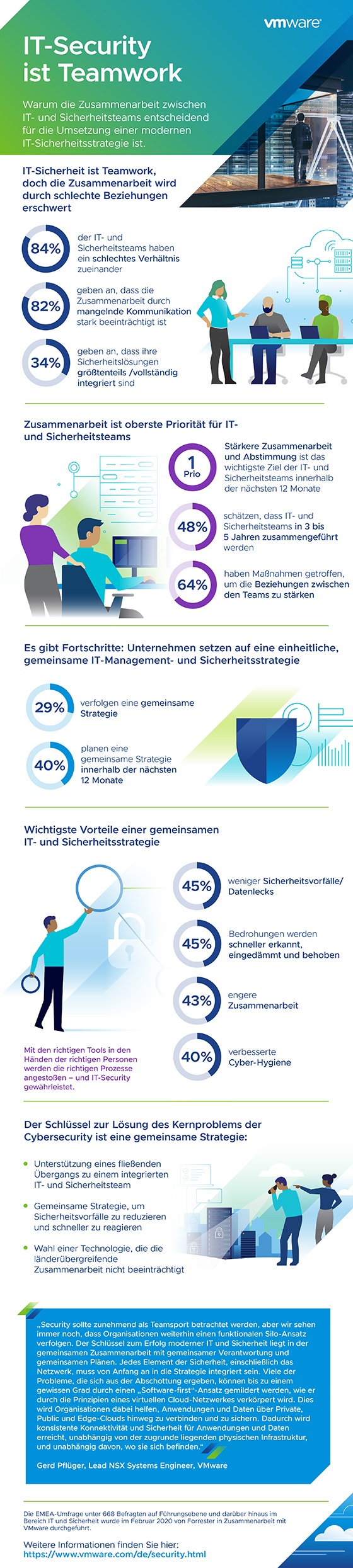 45 Porzent der Befragten in der Forrester-Umfrage geben an, dass eine konsolidierte Strategie dazu beitragen könnte, Datenverstöße zu reduzieren und Bedrohungen schneller zu erkennen. Dies scheint aber nicht so einfach zu sein, denn 84 Prozent der Sicherheits- und IT-Teams geben an, keine besonders gute Beziehung zueinander zu haben.