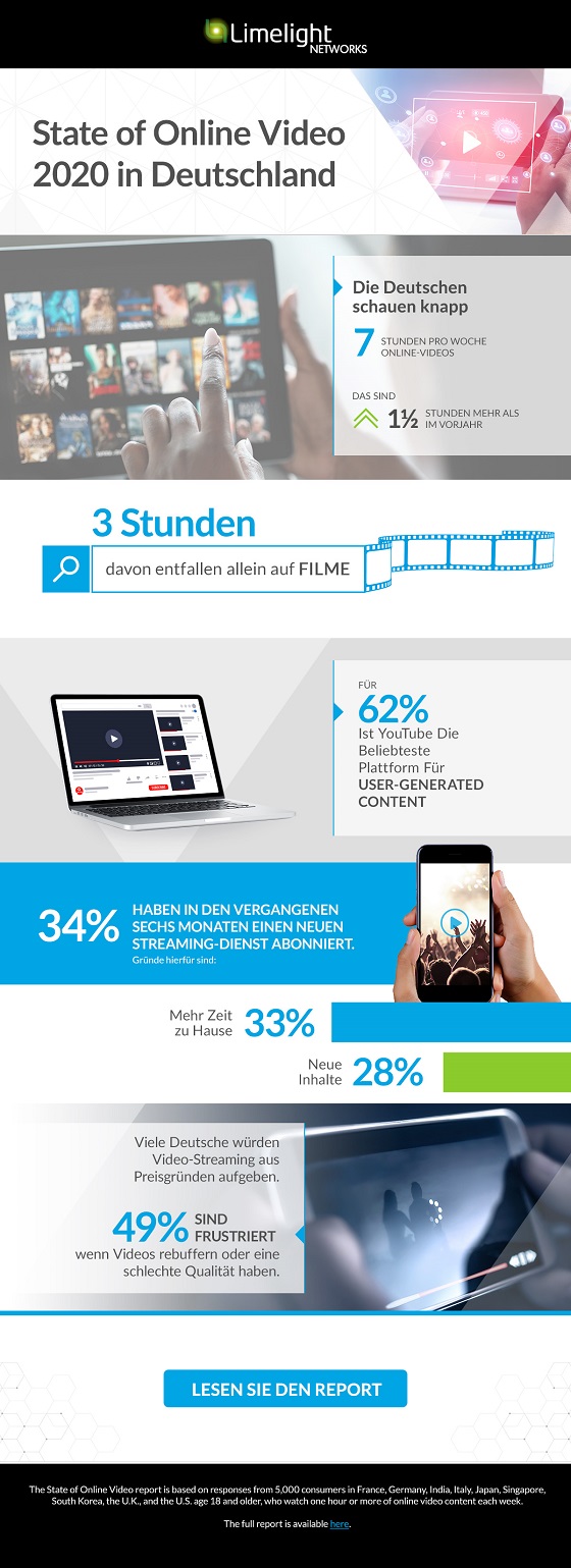Weltweit stieg die Zahl der Videoabrufe um 16 Prozent gegenüber 2019. Für Deutschland bedeutet das einen Anstieg um etwa eine Stunde im Vergleich zum Vorjahr. Das sind die zentralen Ergebnisse des neuen „State of Online Video 2020“ Reports, den der US-Cloud-Spezialist Limelight Networks jetzt veröffentlicht hat.