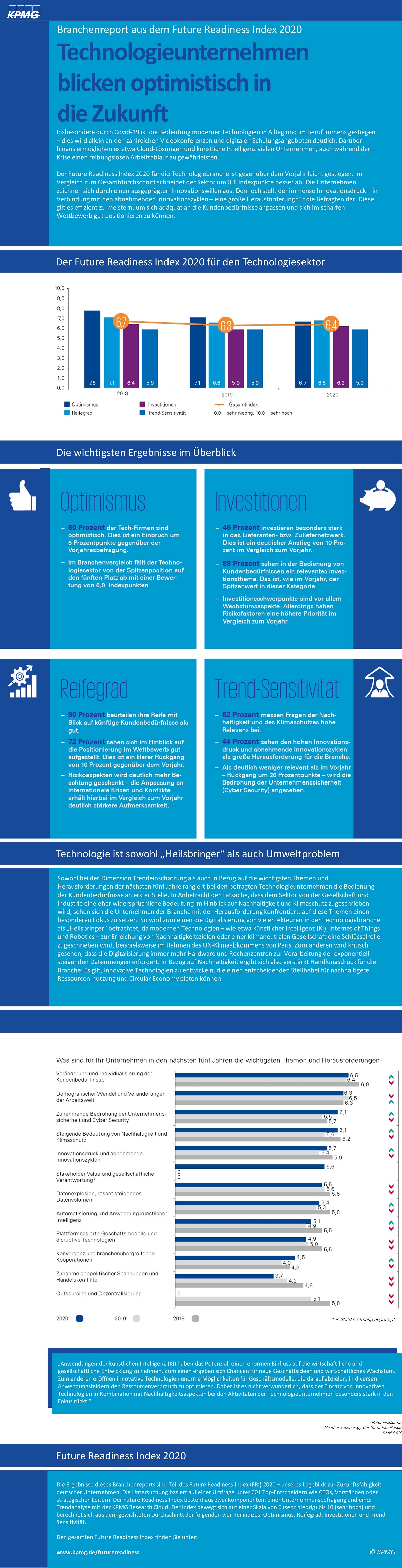 Unter anderem wegen des darin schlummernden Geschäftspotenzials ist der jährlich erhobene sogenannte Future Readiness Index der Unternehmensberatung KPMG für die deutsche Technologiebranche in diesem Jahr gegenüber 2019 leicht gestiegen ist (+0,1 Indexpunkte). Das bedeutet: Technologieunternehmen blicken tendenziell optimistisch in die Zukunft.