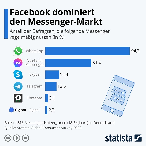 Zugegeben, noch dominieren die Facebook-Dienste den Messenger-Markt deutlich: Hierzulande nutzen mit fast 95 Prozent praktisch alle Deutschen WhatsApp, gefolgt von jedem Zweiten, der regelmäßig zum Facebook Messenger greift: