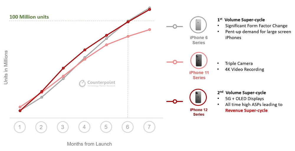 Weil die iPhone 12 zugleich die höchsten durchschnittlichen Verkaufspreise aufweisen, steht Apple damit laut Counterpart Research zugleich auch vor neuen Umsatzrekorden – einem sogenannten Umsatz-Superzyklus.