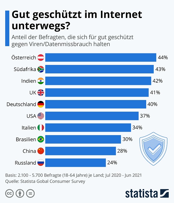 Trotz der hiesigen Sorgen treffen die Deutschen aber nur unzureichend Vorkehrungen für den Schutz ihrer Daten: Demnach sagen auch nur vier von zehn Befragten aus Deutschland, ihre Daten seien gegen Viren und Datenmissbrauch gut geschützt: