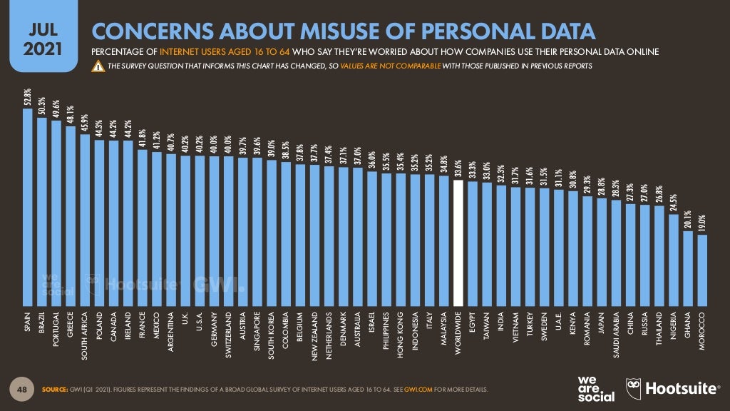 Das ist mehr als der internationale Durchschnitt. Unter allen 46 betrachteten Staaten liegt die Quote derer, die sich um ihre persönlichen Daten sorgen, nur bei 33 Prozent – sprich nur jeder Dritte fürchtet Datenverluste.