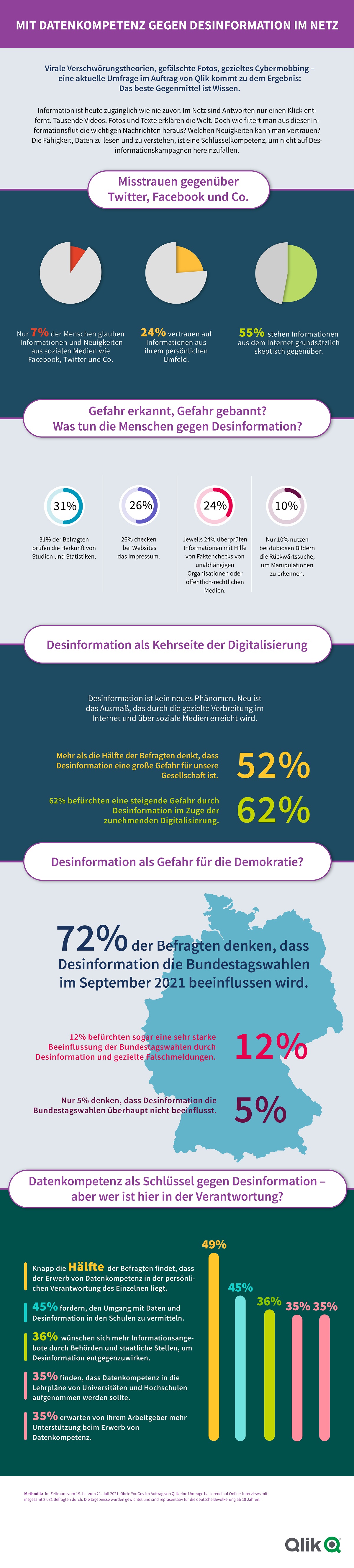 Dies ist das zentrale Ergebnis einer repräsentativen Umfrage im Auftrag des Datenanalyse-Anbieters Qlik mit Hauptsitz in Radnor im US-Bundesstaat Pennsylvania zum Thema Desinformation unter mehr als 2000 Bundesbürgern.