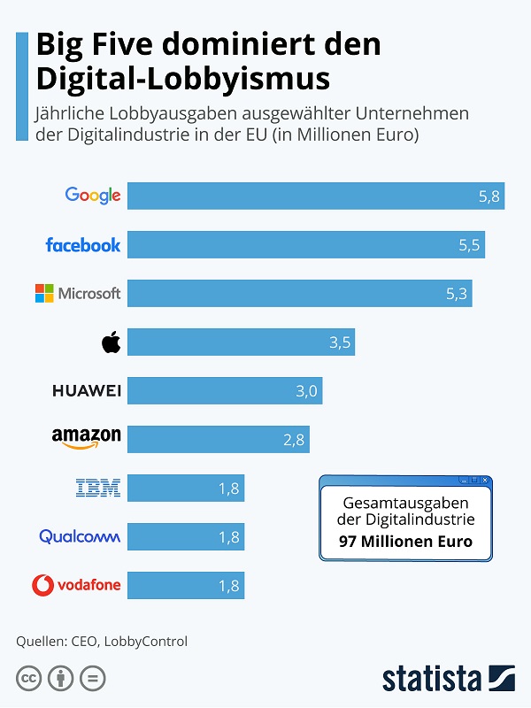 Zugleich ist auffällig: Es sind gerade die Big Five, die für einen Großteil der Lobbyausgaben der Digitalindustrie in der EU verantwortlich sind. In diese GAFAM-Phalanx hat sich mit Huawei bloß ein Konkurrent aus China hineingezwängt: